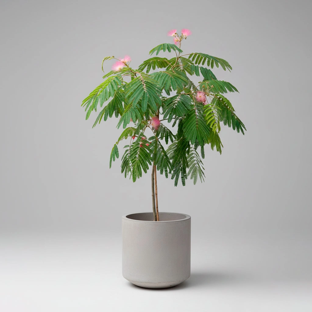 Un árbol de porte pequeño a mediano, perfecto para jardines o terrazas con sol, que ofrece una floración inusual y etérea en verano. Sus flores rosadas y plumosas, que parecen pompones de seda, y sus hojas de helecho le dan un aire exótico. Es un árbol resistente a la sequía y de crecimiento relativamente rápido, ideal para dar altura y una sombra suave en el clima soleado de Lima. Una pieza premium para paisajismo en azoteas.