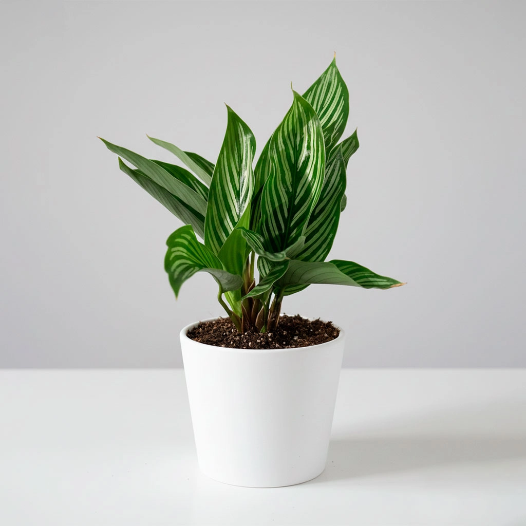 Hojas ovaladas de color verde oscuro, marcadas por un patrón de finas líneas blancas que se extienden desde el centro. Esta Calathea es pura elegancia geométrica. Es un acento de diseño perfecto para colecciones, requiriendo humedad y luz indirecta, ideal para un rincón de sofisticación botánica.