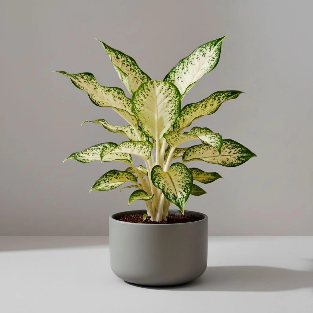 Una planta de gran presencia con hojas anchas, verdes y un centro de color crema o blanco brillante. La Dieffenbachia Camilla es ideal para salones con luz media, aportando un acento tropical y claro. Su tamaño la hace perfecta para rellenar esquinas vacías. Aunque es sensible al frío, el clima templado de Lima la hace una excelente opción de interior. Sus hojas claras actúan como un punto de luz en rincones oscuros.
