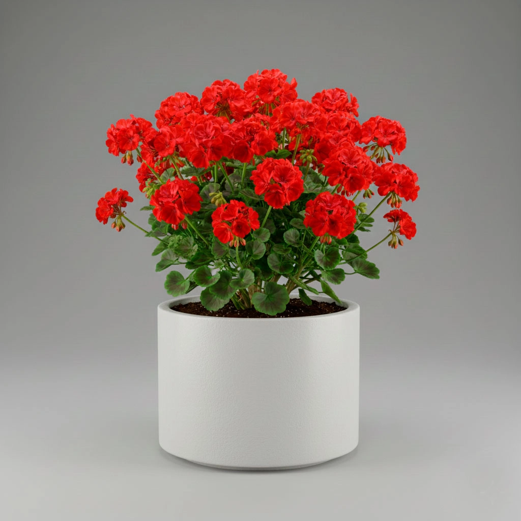 Geranio Híbrido de floración escarlata continua. Ideal para sol pleno en balcones de Lima. Resistente al calor y fácil de cuidar. Geranio para balcón Lima.