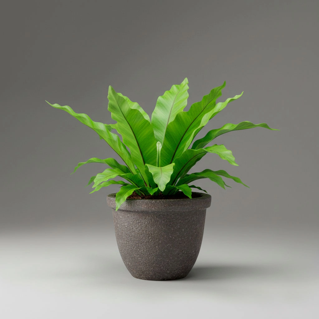 Este helecho es pura arquitectura natural. Sus frondas anchas y rígidas se disponen en forma de roseta, simulando un nido. Es perfecto para aportar textura y volumen a estanterías o mesas. A diferencia de otros helechos, el Nido de Ave requiere menos pulverización, aunque sigue disfrutando de la humedad. Es la opción ideal para añadir un toque orgánico y salvaje a tu decoración minimalista.