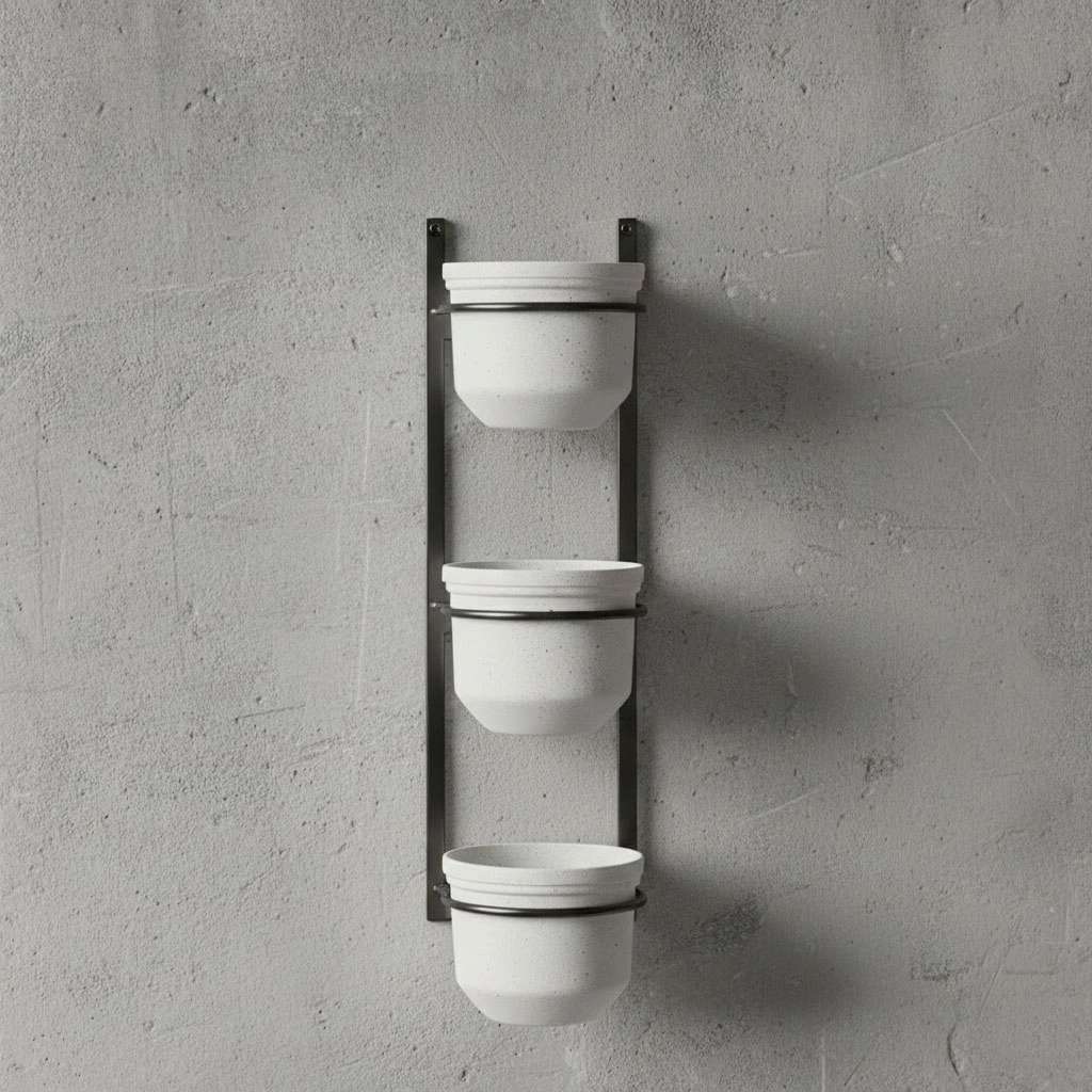 Solución de jardinería vertical para balcones pequeños o paredes de cocina. Este sistema modular de plástico reciclado permite colgar varias macetas en vertical, optimizando el espacio. Es una forma elegante de crear un muro de hierbas aromáticas o flores. El diseño discreto en color gris permite que sea el follaje el verdadero protagonista. Perfecto para los apartamentos limeños donde cada metro cuadrado cuenta.