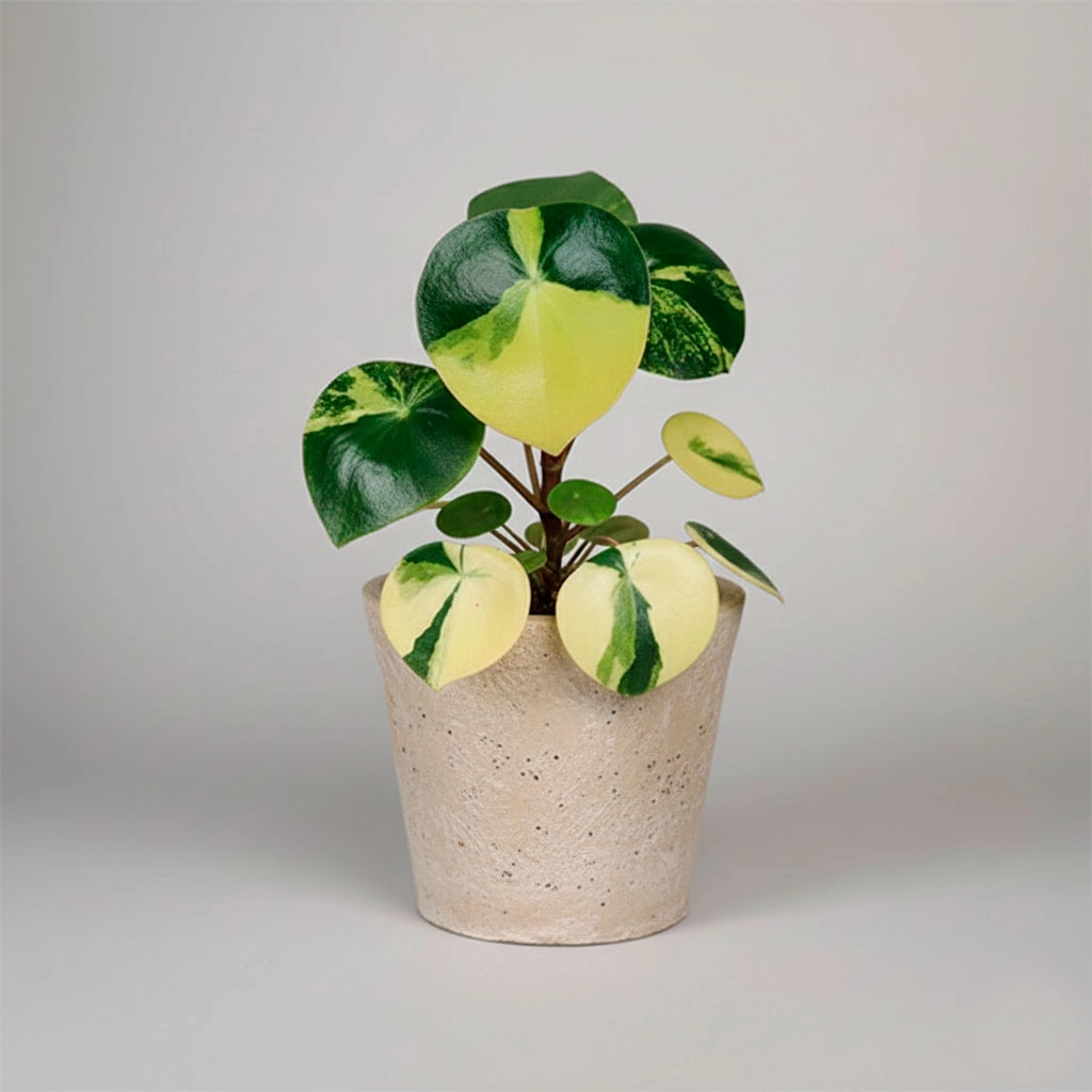 La versión variegada de la Peperomia ‘Lluvia de Monedas’. Sus hojas redondas y brillantes presentan un borde crema o blanco, añadiendo luminosidad a la planta. Es compacta y de bajo mantenimiento, ideal para escritorios. La variegación requiere más luz que la variedad verde.