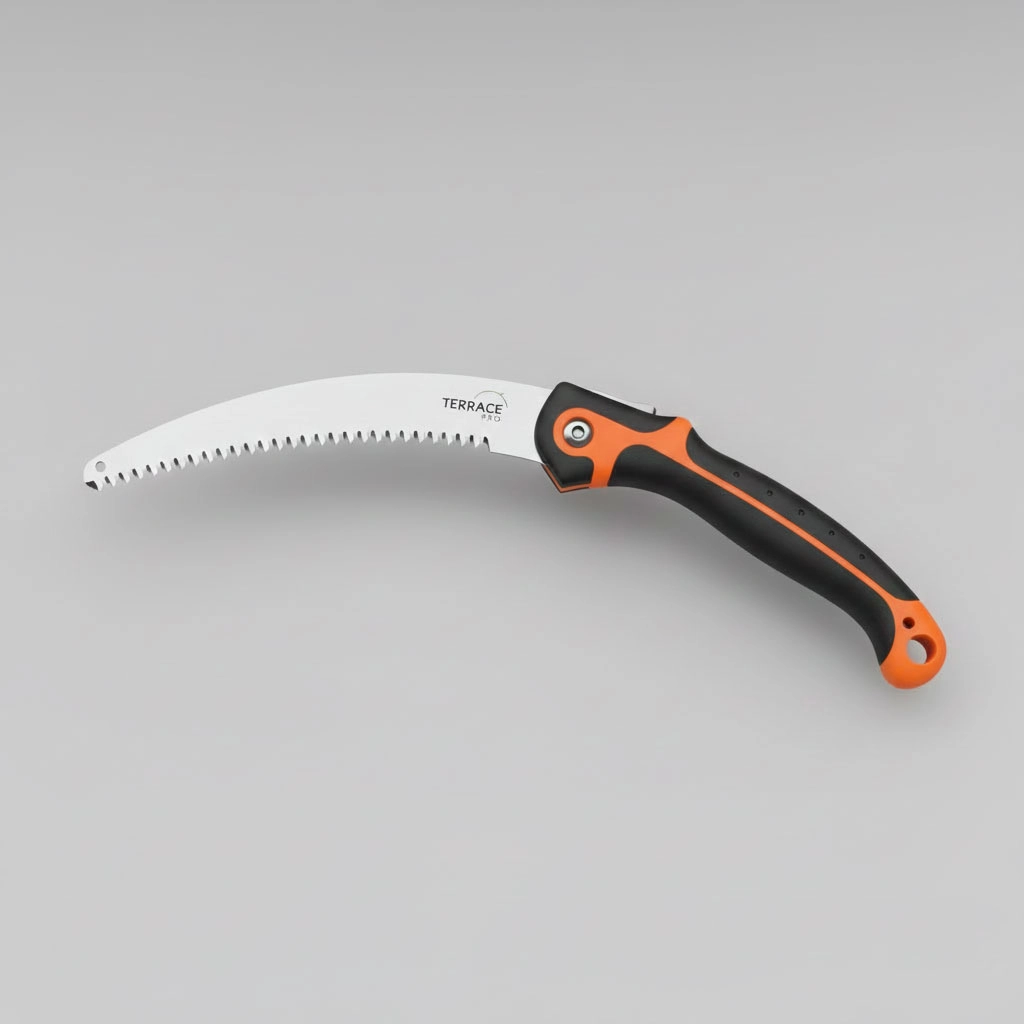 Sierra de hoja curva y plegable, ideal para cortar ramas medianas y gruesas en árboles de terraza (Olivos, Cítricos). La hoja de acero de alta calidad garantiza un corte limpio y suave, esencial para la salud del árbol. El diseño plegable la hace segura y fácil de almacenar en tu kit de herramientas.